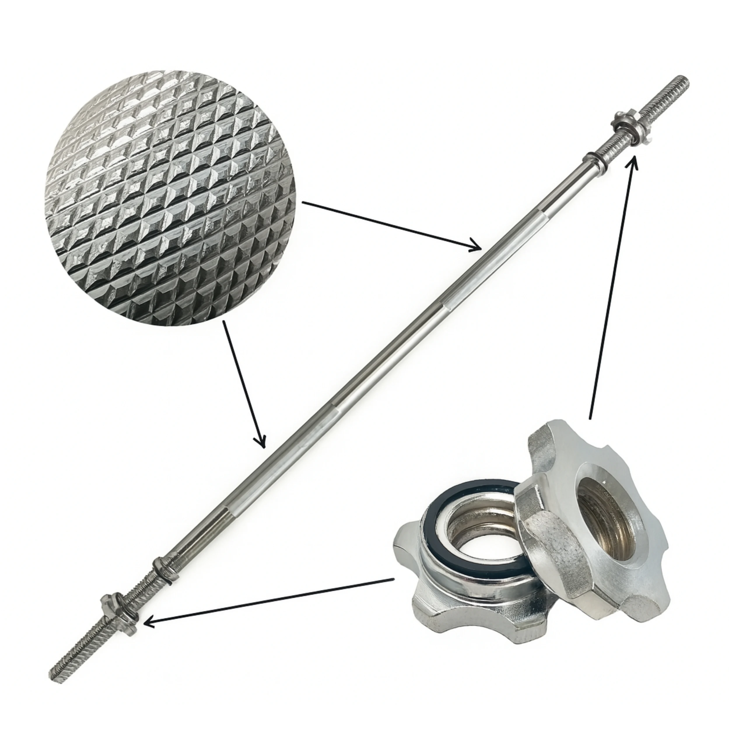 Solidna sztanga wykonana z hartowanej, chromowanej stali zapewnia długowieczność, odporność na korozję i świetny wygląd. Dzięki precyzyjnemu wykonaniu idealnie nadaje się do intensywnych treningów siłowych, zarówno w domowej siłowni, jak i w klubie fitness.