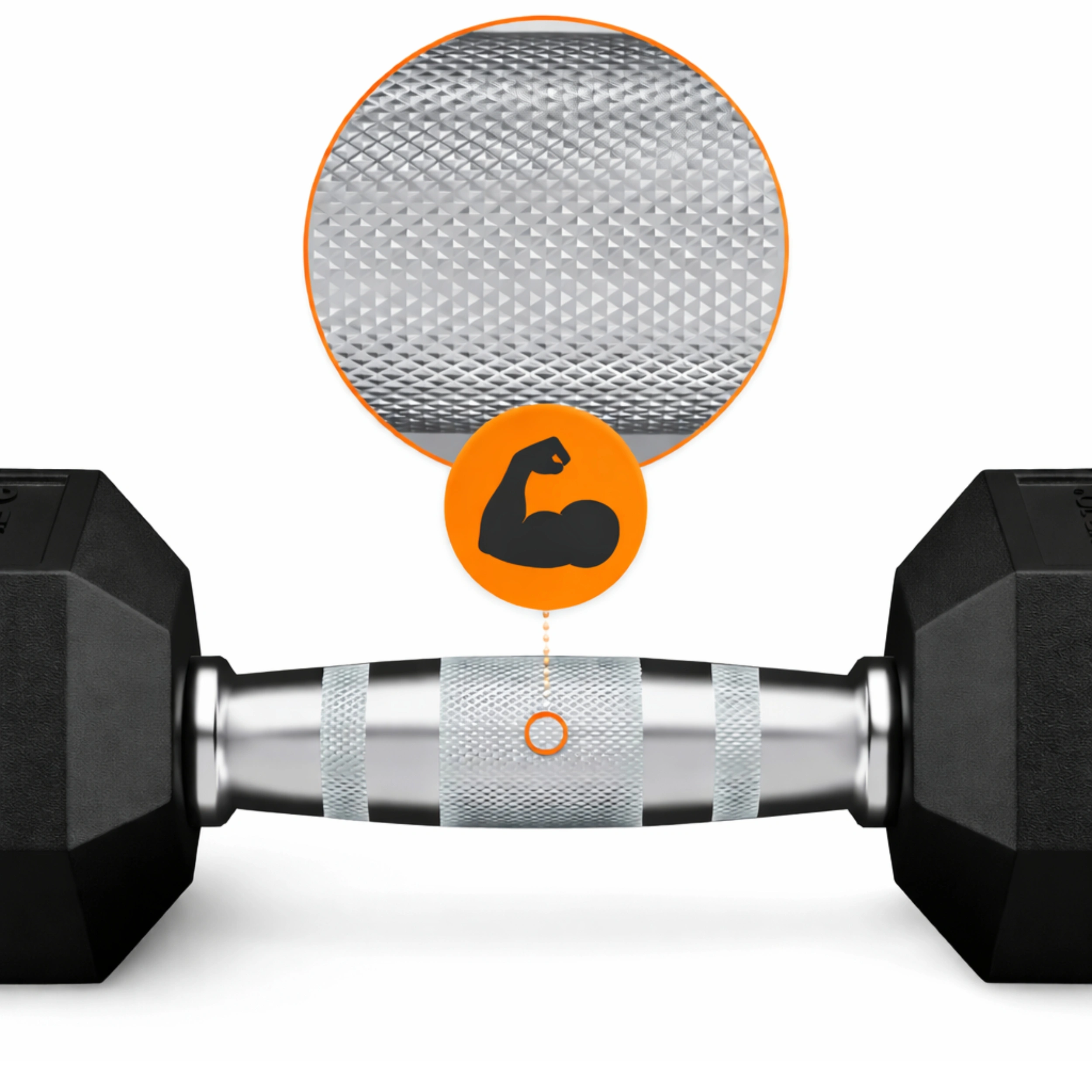 ▶️ Radełkowany, chromowany uchwyt gwarantuje pewny chwyt i dobrą kontrolę ruchu, dzięki czemu hantla stabilnie leży w dłoni nawet podczas bardziej wymagających serii.