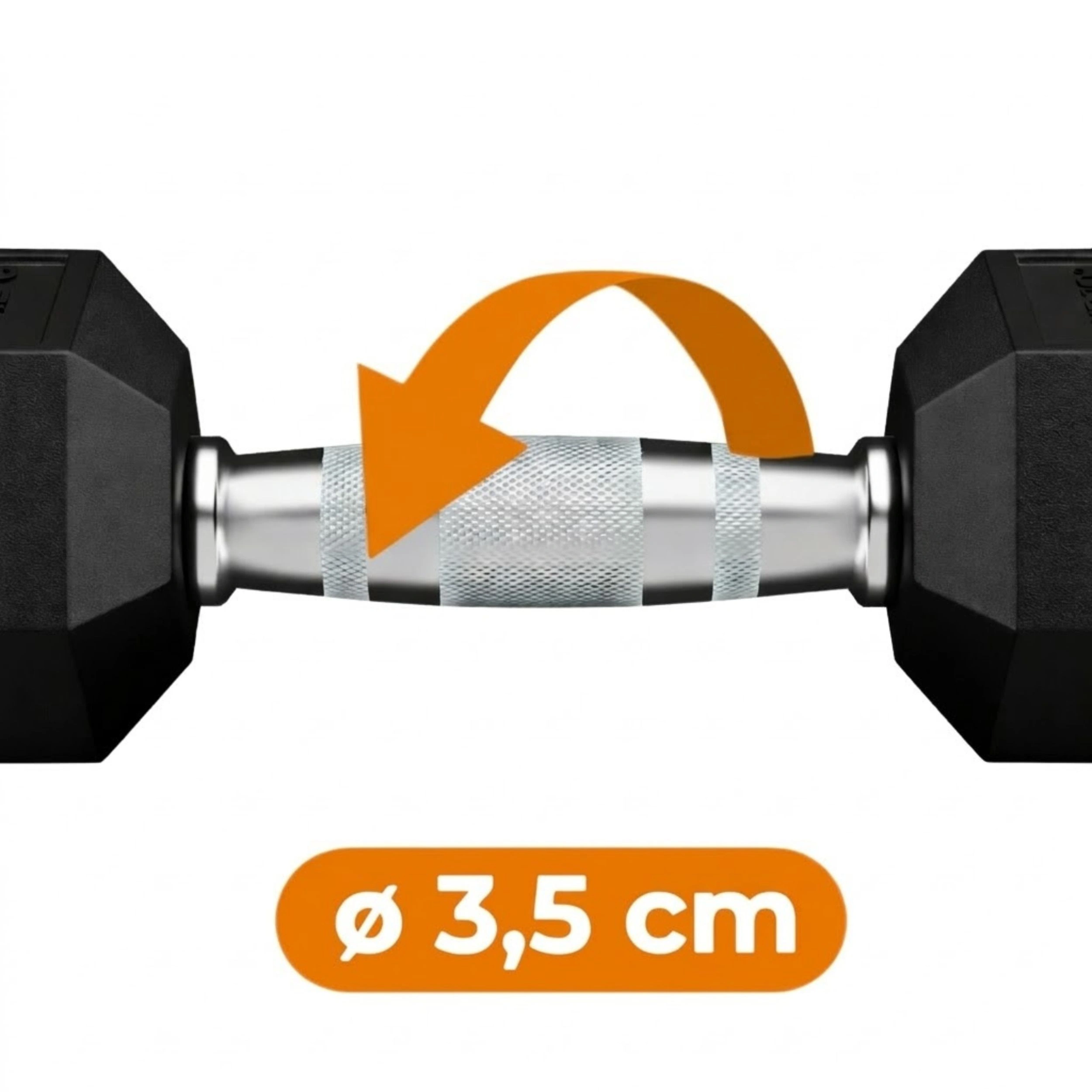 Chromowany uchwyt z antypoślizgową, radełkowaną powierzchnią poprawia przyczepność i ogranicza ryzyko wyślizgnięcia się hantli z ręki nawet podczas intensywnego treningu. Średnica Ø 3,5 cm sprzyja pewnemu chwytowi przy ćwiczeniach siłowych, funkcjonalnych i ogólnorozwojowych.