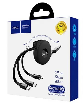 Kabel USB 3w1 Hoco jest płaski, wykonany z solidnego materiału, jest bardzo wygodny w użytkowaniu, a zarazem mocny i trwały.
