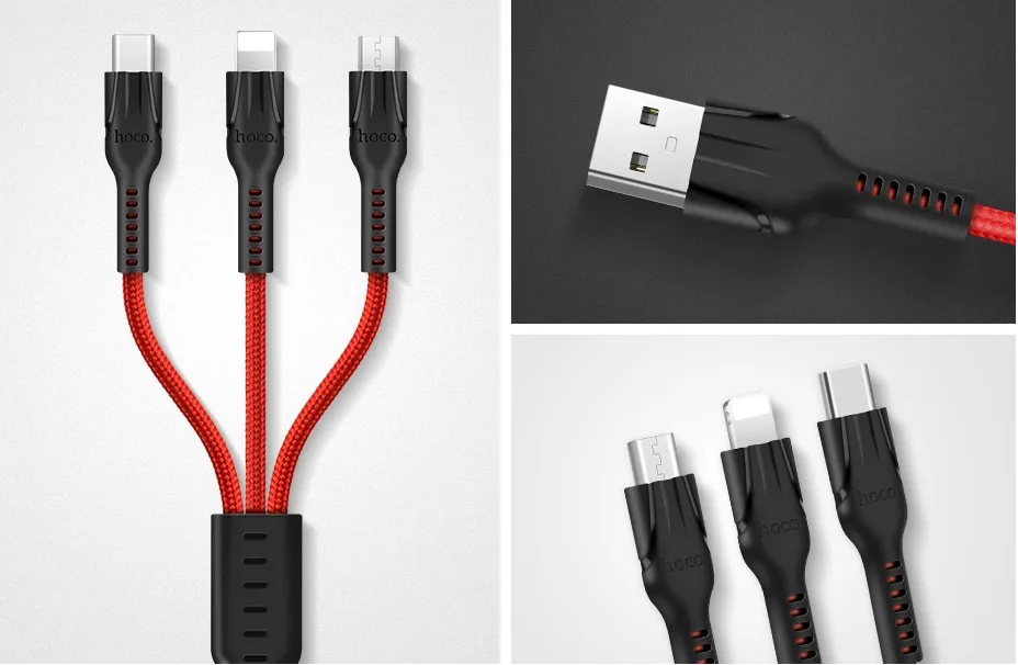 Mocny kabel hoco 3w1 to ergonomiczne rozwiązanie gdy posiadamy kilka urządzeń z różnymi gniazdami - kabel 3w1 zapewnia kompatybilność ze złączami: