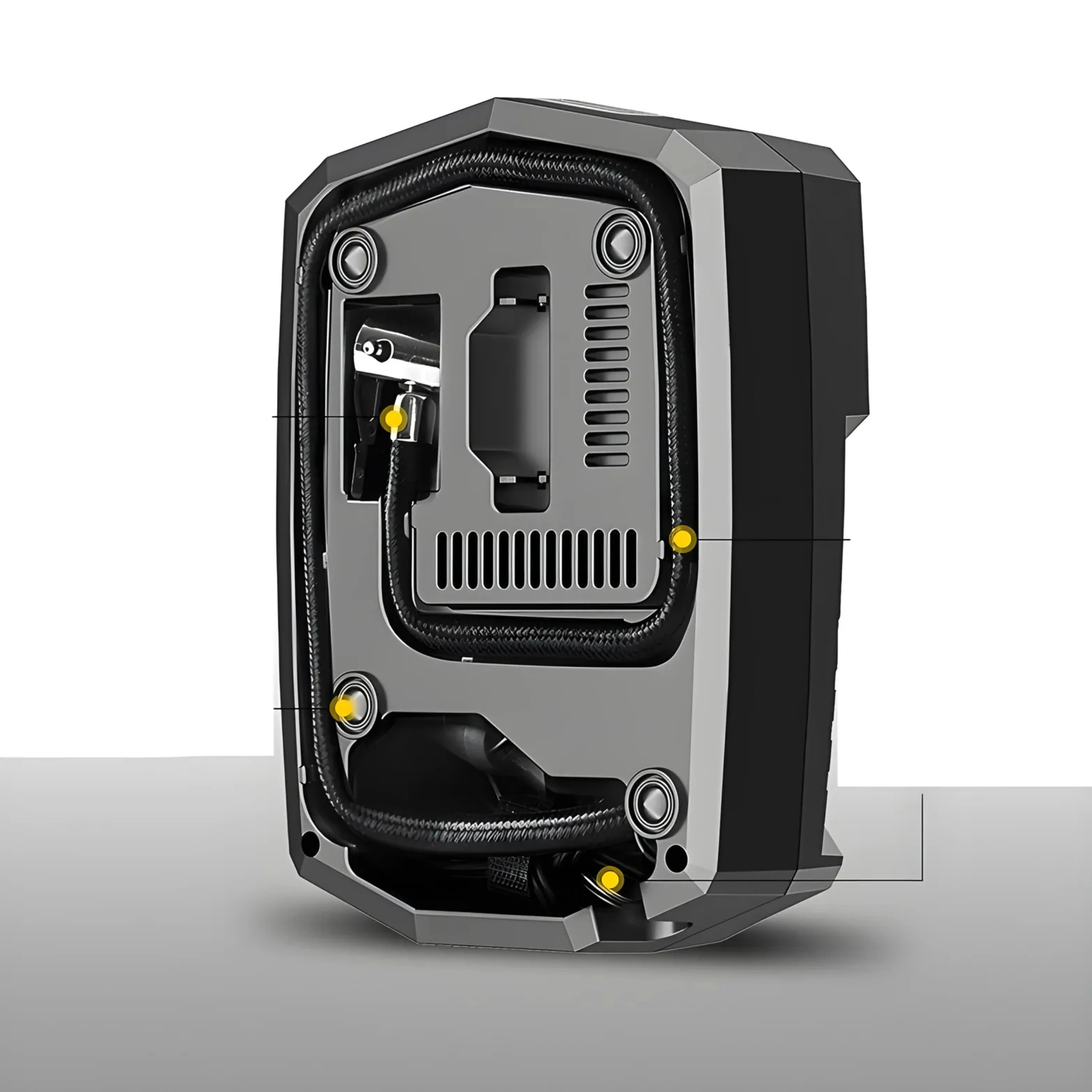 Dodatkowo urządzenie posiada elastyczny wąż ciśnieniowy o długości 50 cm, który umożliwia swobodne manewrowanie przy zaworze, nawet w trudno dostępnych miejscach. Połączenie długiego przewodu zasilania i wygodnego węża sprawia, że korzystanie z kompresora jest komfortowe, szybkie i bezproblemowe w każdych warunkach – zarówno na parkingu, jak i w trasie.