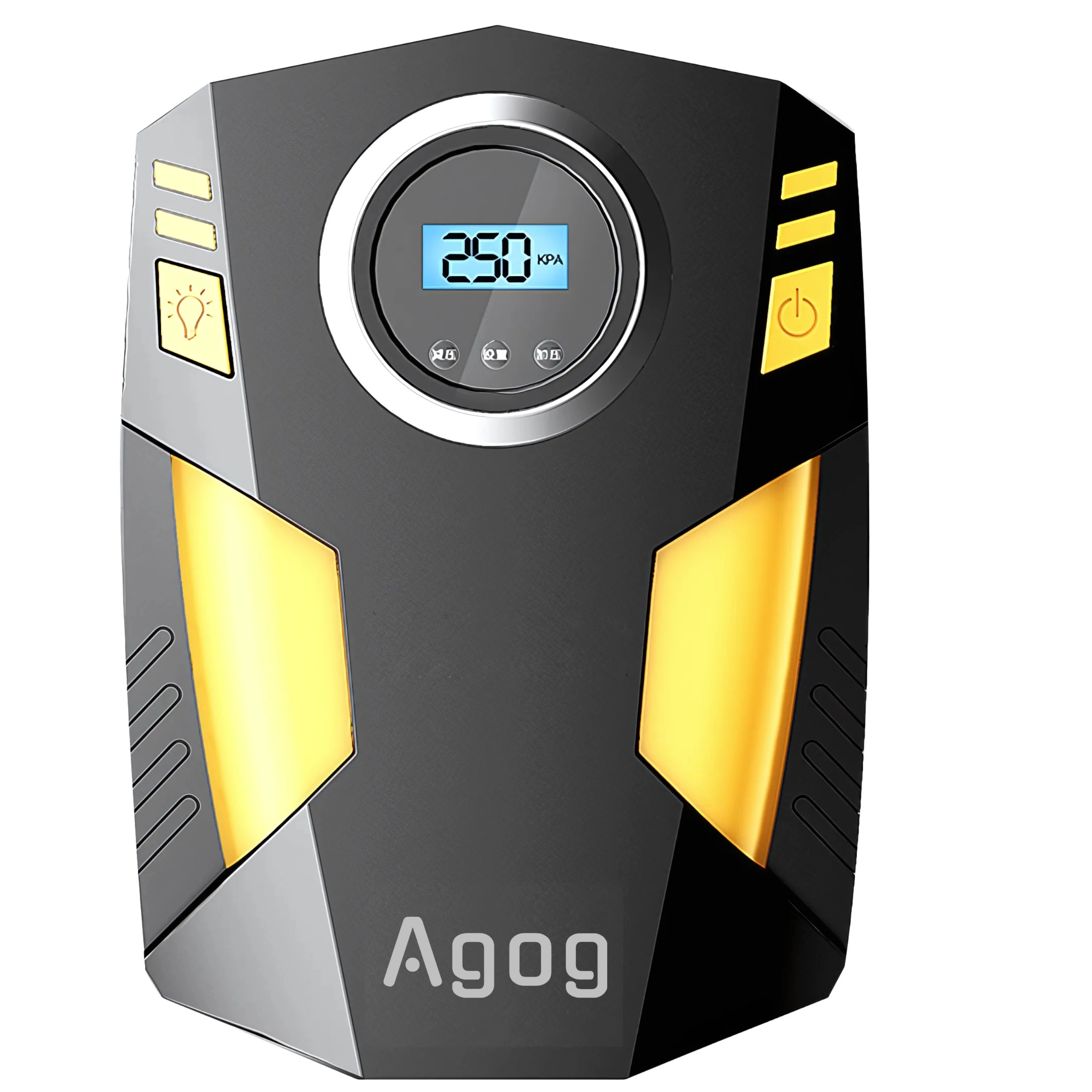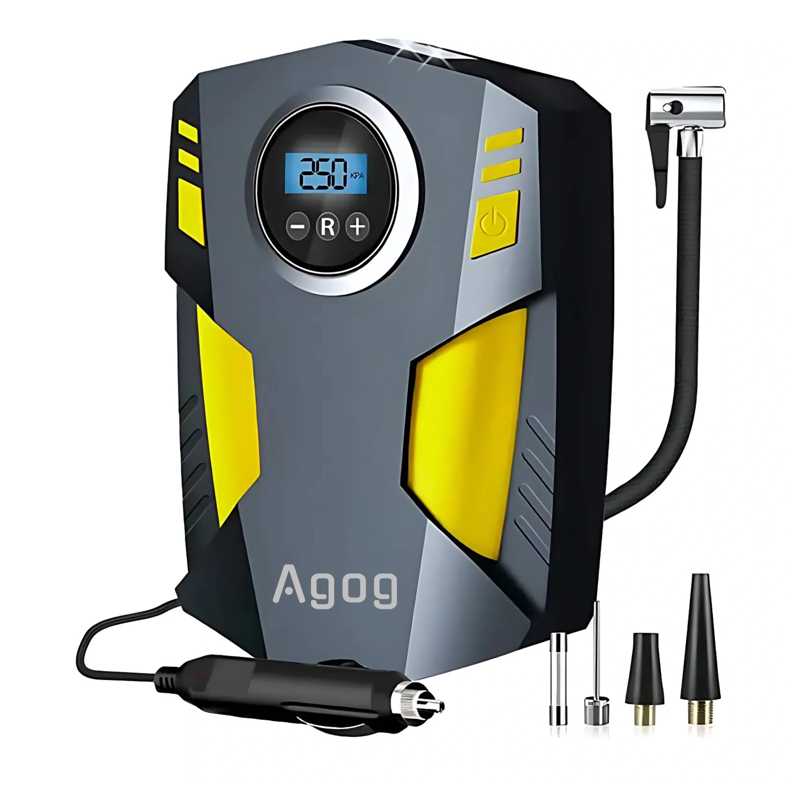 Podłącz kompresor do zasilania, ustaw przyciskami "+" oraz "-" zadaną wartość ciśnienia, przyciskiem R możesz zmienić jednostkę (PSI / BAR / KPA / KG/CM3) - włącz działanie kompresora przyciskiem z prawej strony.