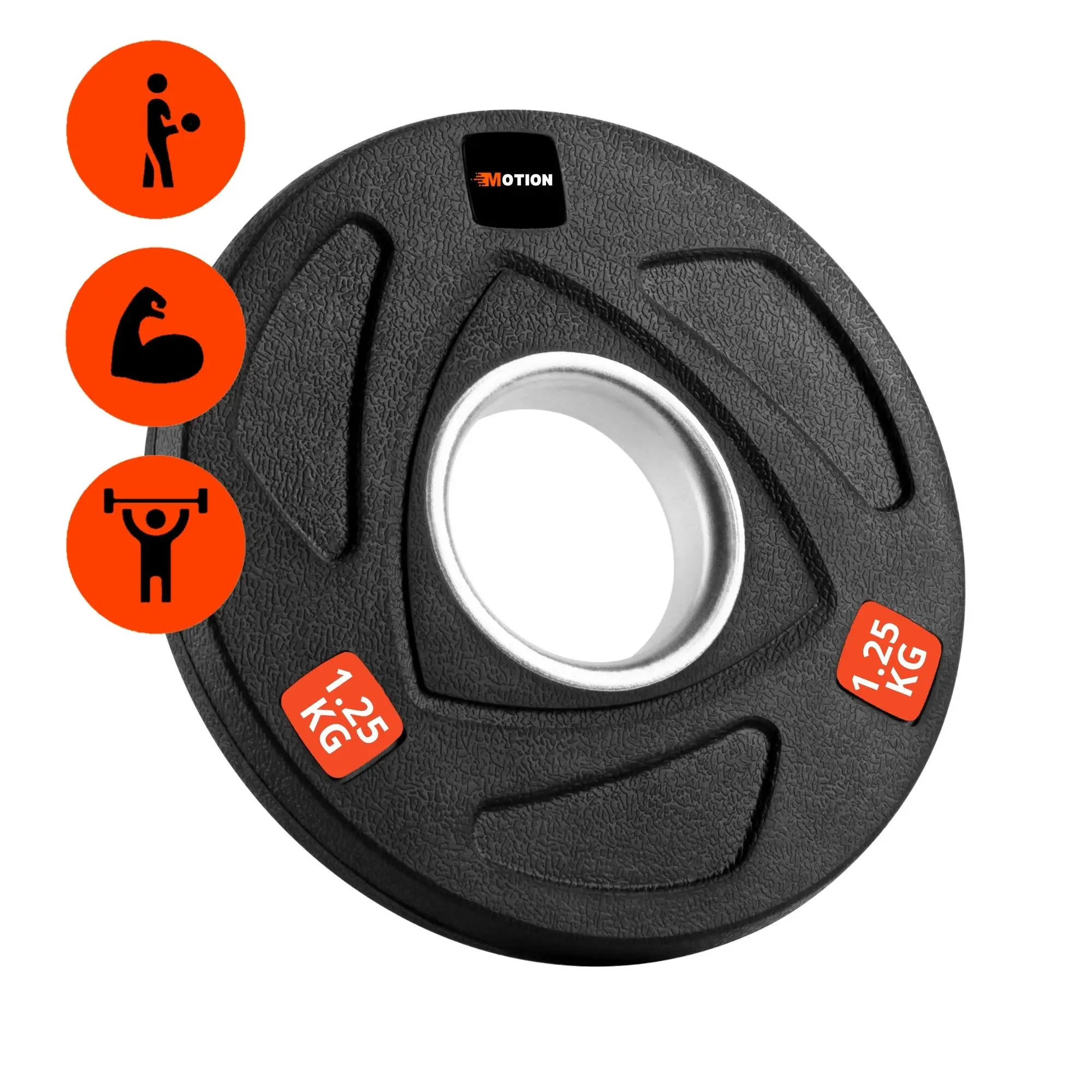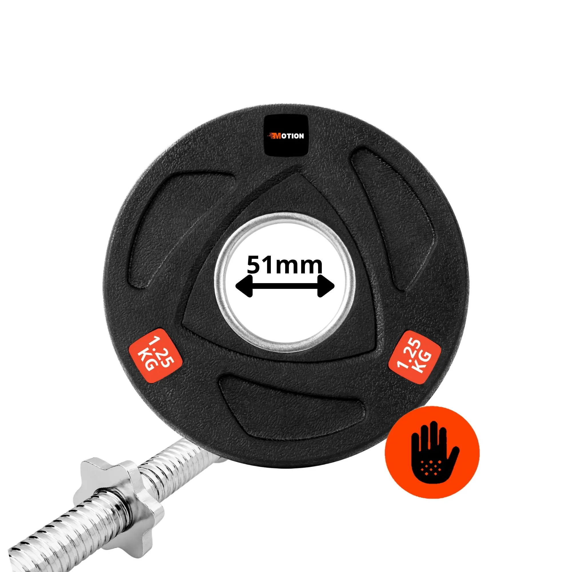 Dzięki otworowi o średnicy 51 mm, obciążenie MOTION spełnia wymogi standardu olimpijskiego, co oznacza pełną kompatybilność ze wszystkimi gryfami olimpijskimi o średnicy 50 mm. To uniwersalne rozwiązanie sprawia, że talerze możesz swobodnie wykorzystywać zarówno w treningu domowym, jak i w profesjonalnych siłowniach.