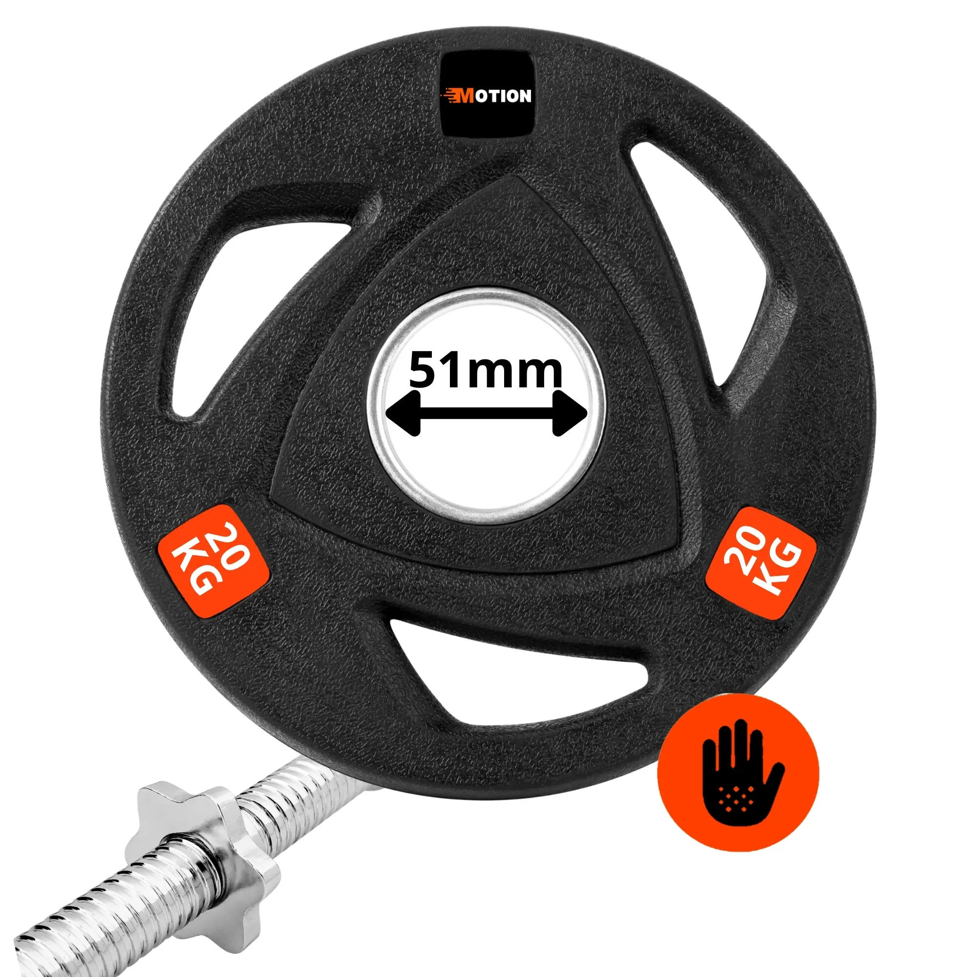 Dzięki otworowi o średnicy 51 mm, obciążenie MOTION spełnia wymogi standardu olimpijskiego, co oznacza pełną kompatybilność ze wszystkimi gryfami olimpijskimi o średnicy 50 mm. To uniwersalne rozwiązanie sprawia, że talerze możesz swobodnie wykorzystywać zarówno w treningu domowym, jak i w profesjonalnych siłowniach.