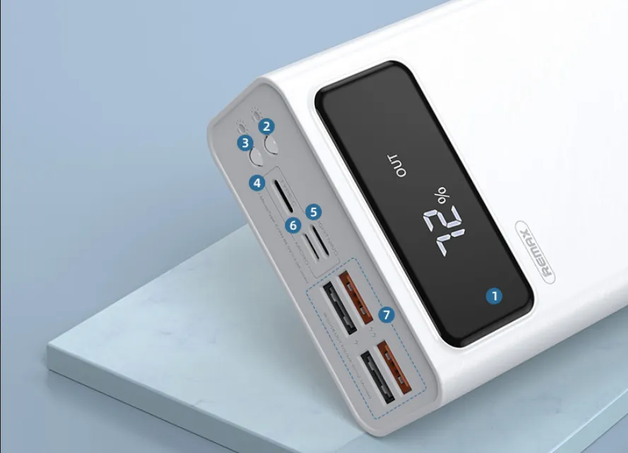 Przenośny akumulator posiada 4 wyjścia USB-A oraz 3 popularne wejścia dzięki czemu możliwe jest ładowanie 4 urządzeń jednocześnie