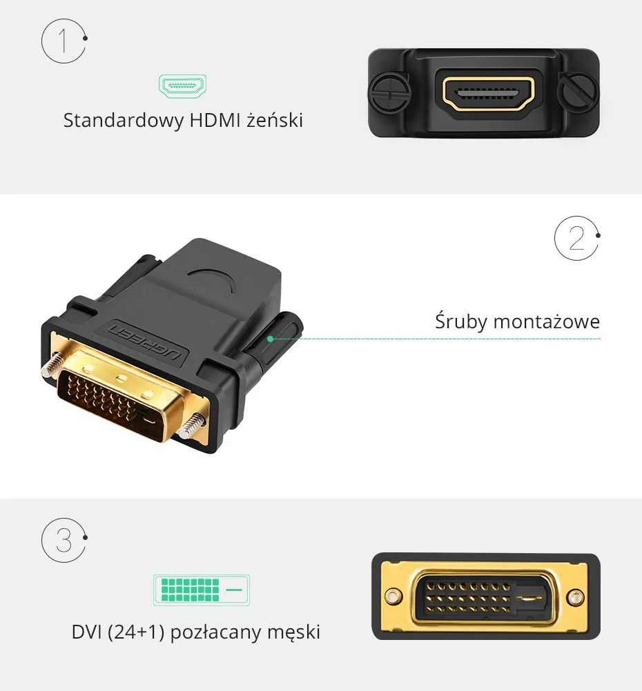 Adapter DVI-HDMI producenta klasy premium Ugreen, wykonującego swoje akcesoria z dbałością o detale i tylko z wysokiej jakości materiałów.