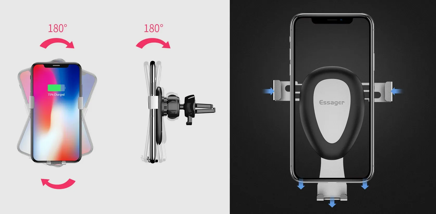 Ergonomicznie zaprojektowany samochodowy uchwyt Essager z otworem na ładowarkę.