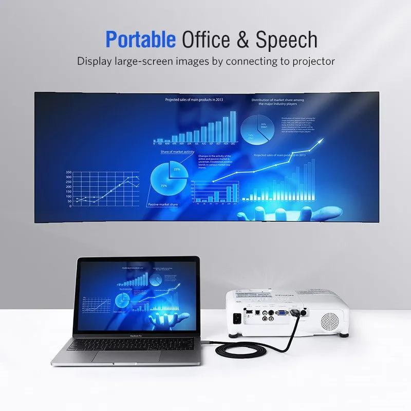 Kabel UGREEN USB-C do HDMI przesyła obraz i dźwięk wysokiej jakości z urządzenia z portem USB-C do telewizora, monitora lub projektora z interfejsem HDMI. Dzięki temu można łatwo przenieść zawartość ekranu telefonu lub laptopa na duży ekran i cieszyć się wysokiej jakości obrazem.