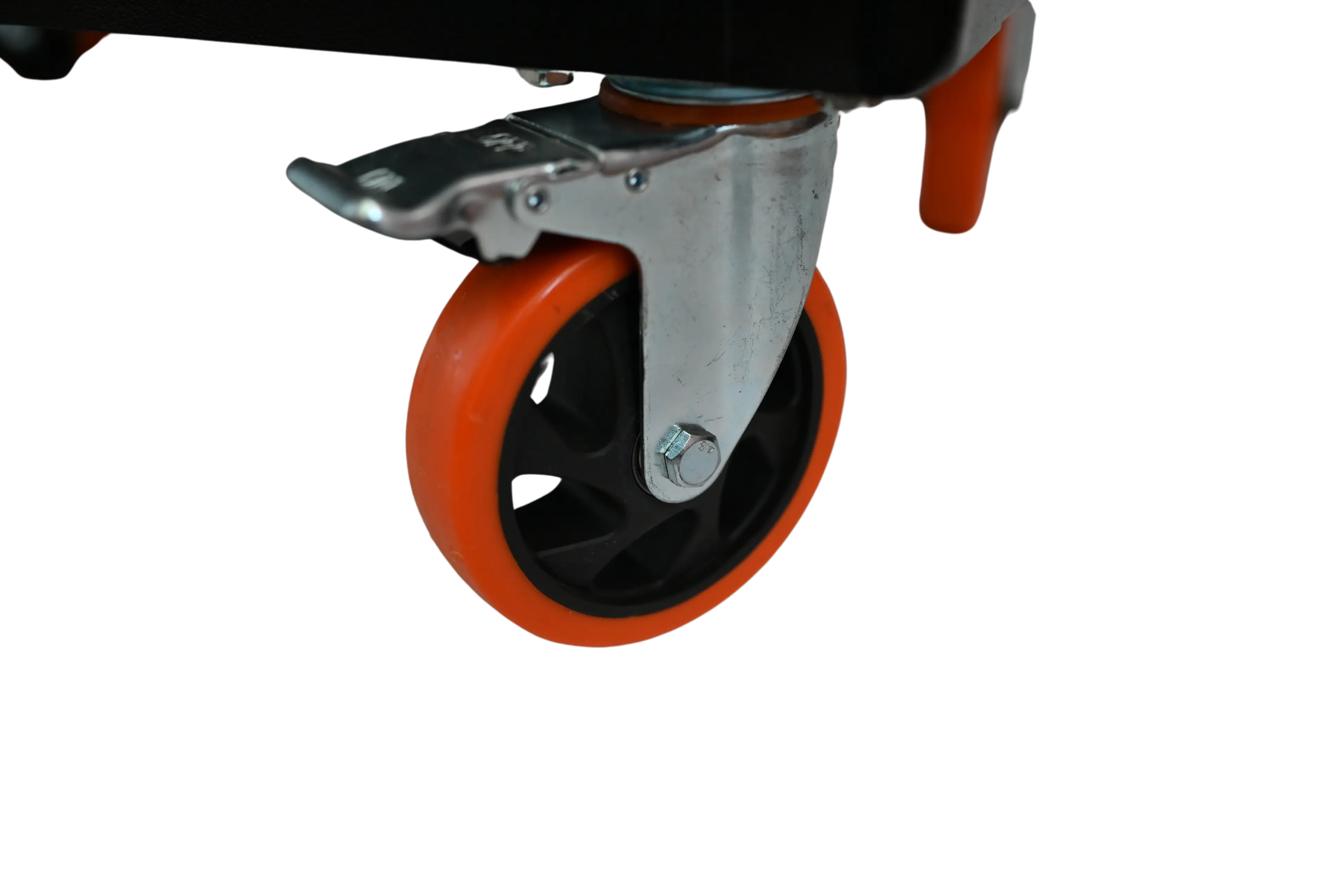 Zadbaliśmy również o komfort przemieszczania wózka – wyposażony jest on w duże, kierowane koła z hamulcem, gwarantując bezpieczne i stabilne przemieszczanie się nawet na lekkich pochyłościach.