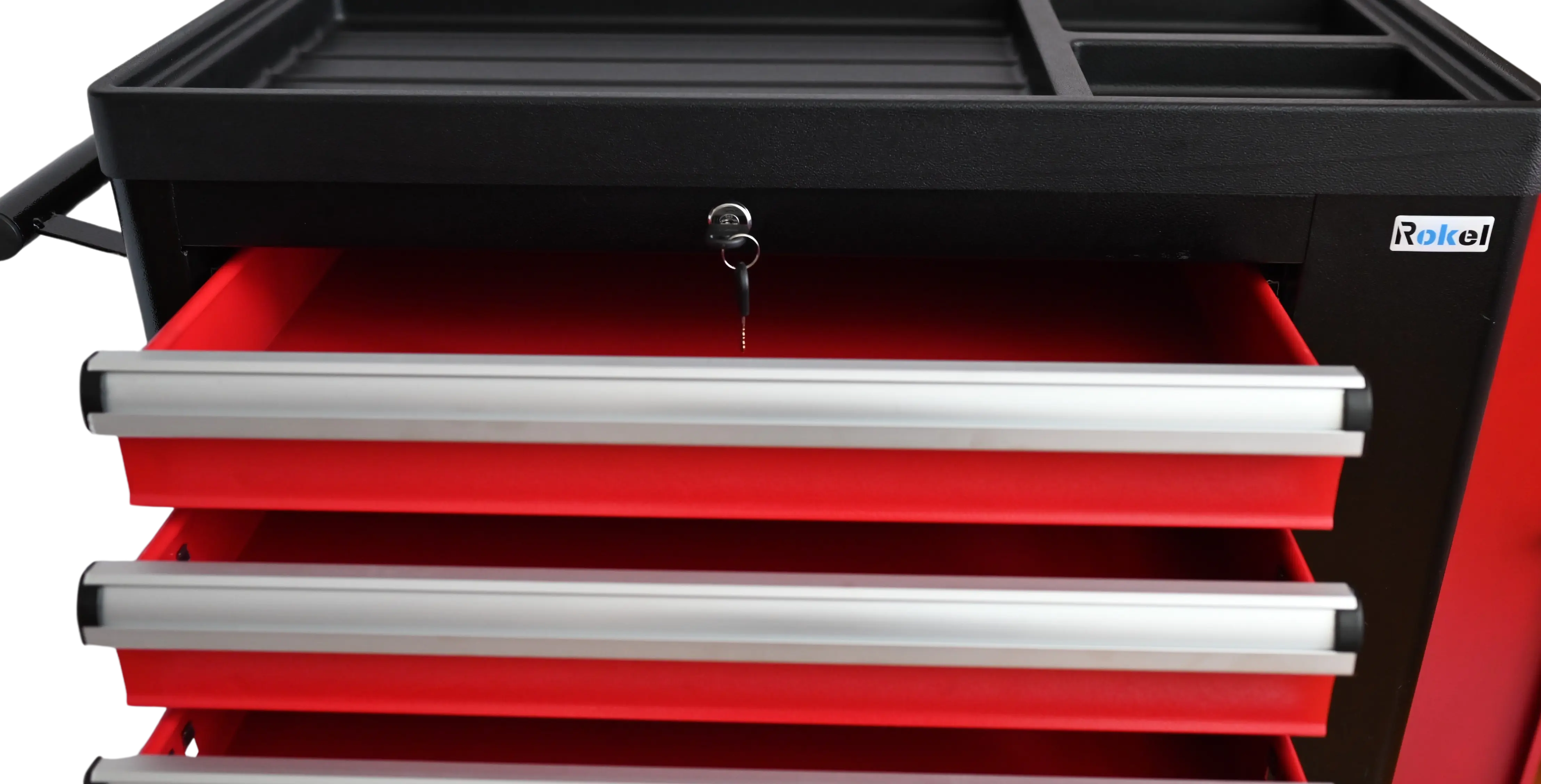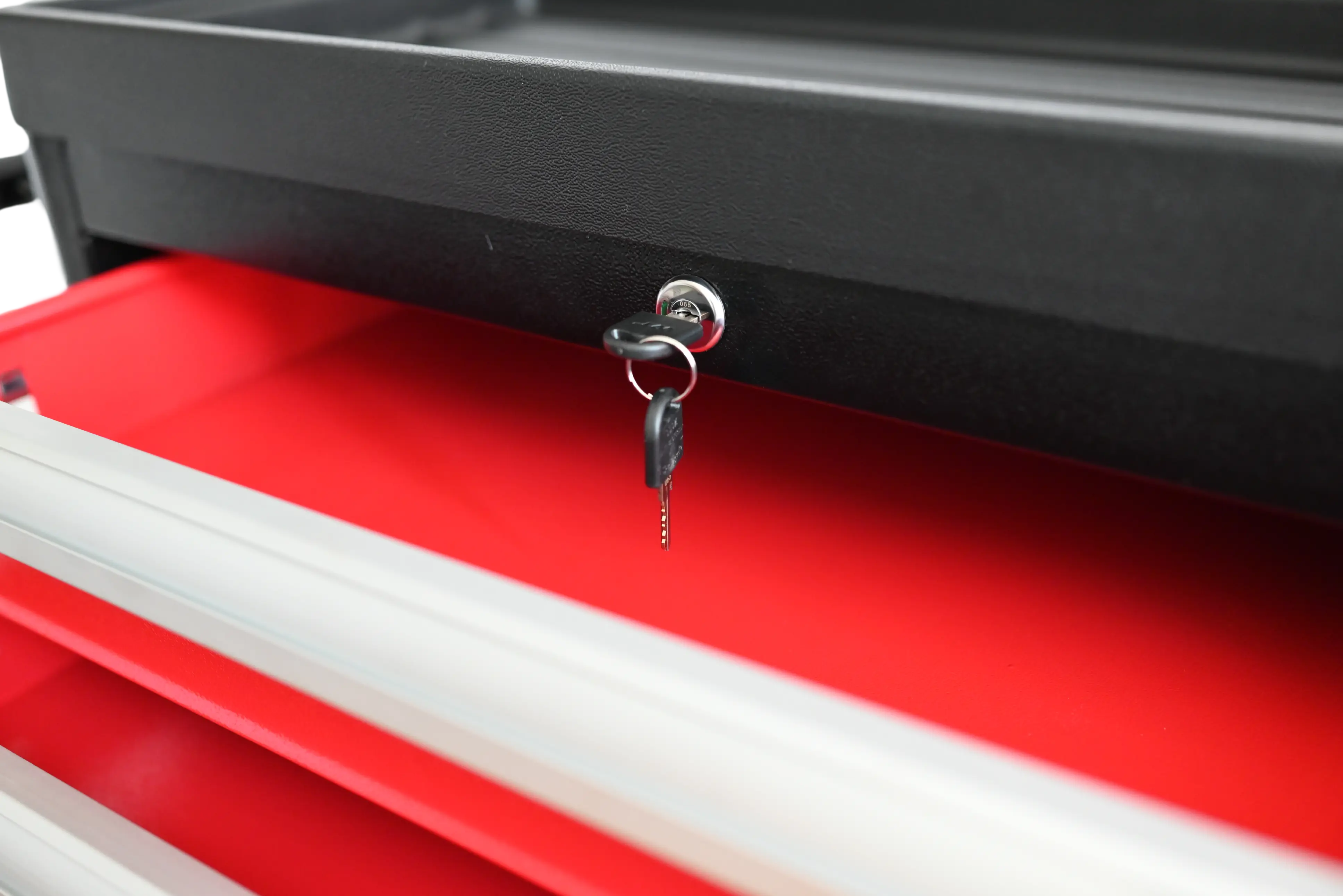 Bezpieczeństwo Twoich narzędzi i akcesoriów to priorytet. Nasza unikalna konstrukcja wyposażona jest w centralny zamek, umożliwiający zamykanie wszystkich szuflad jednym ruchem klucza. Dzięki temu masz pewność, że po zakończonej pracy wszystkie Twoje narzędzia są bezpieczne.