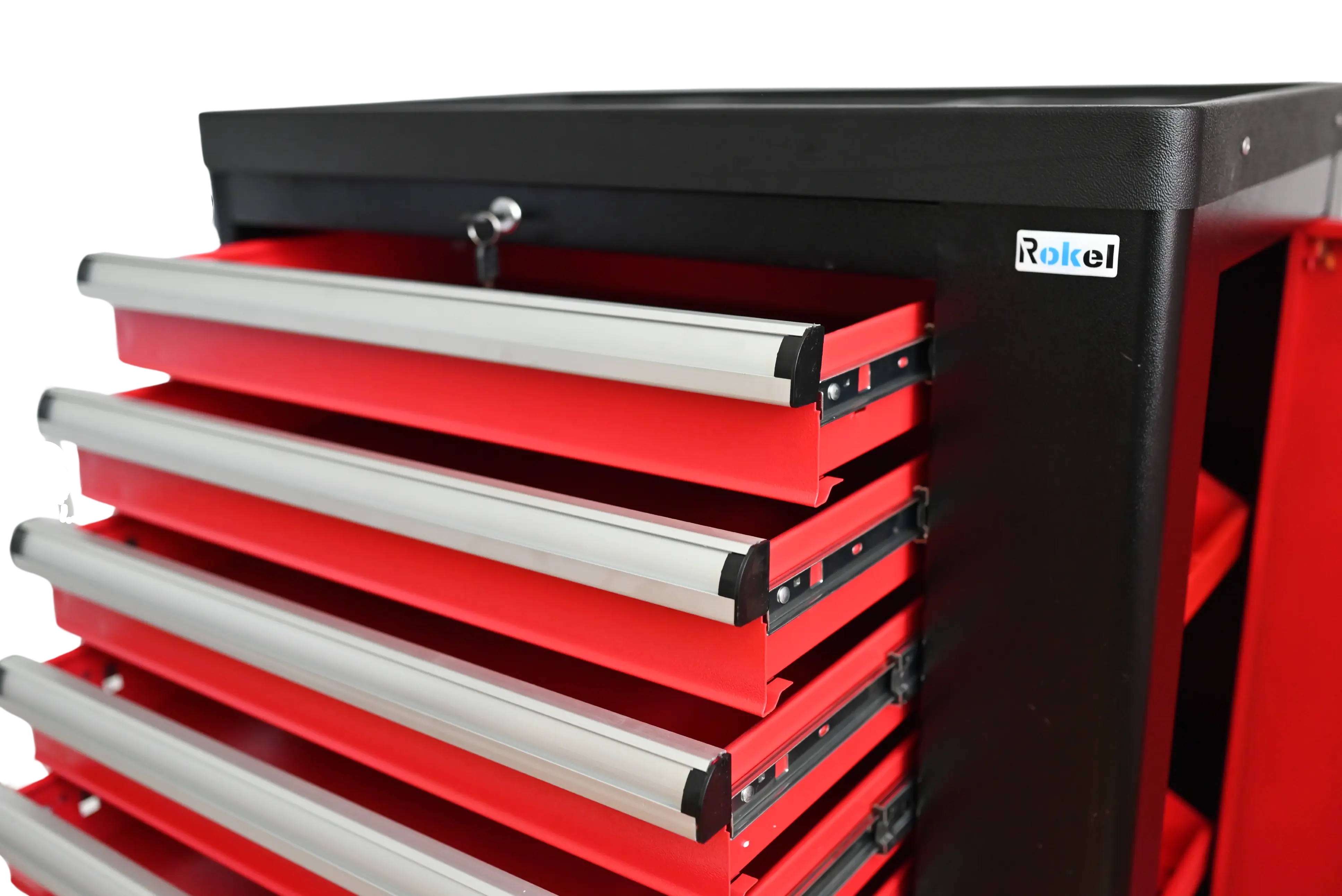 Dodatkowo każda szuflada została dodatkowo wyposażona w delikatną blokadę, która zapobiega samoistnemu wysuwaniu się, chroniąc Twoje narzędzia i zapewniając bezpieczeństwo pracy.