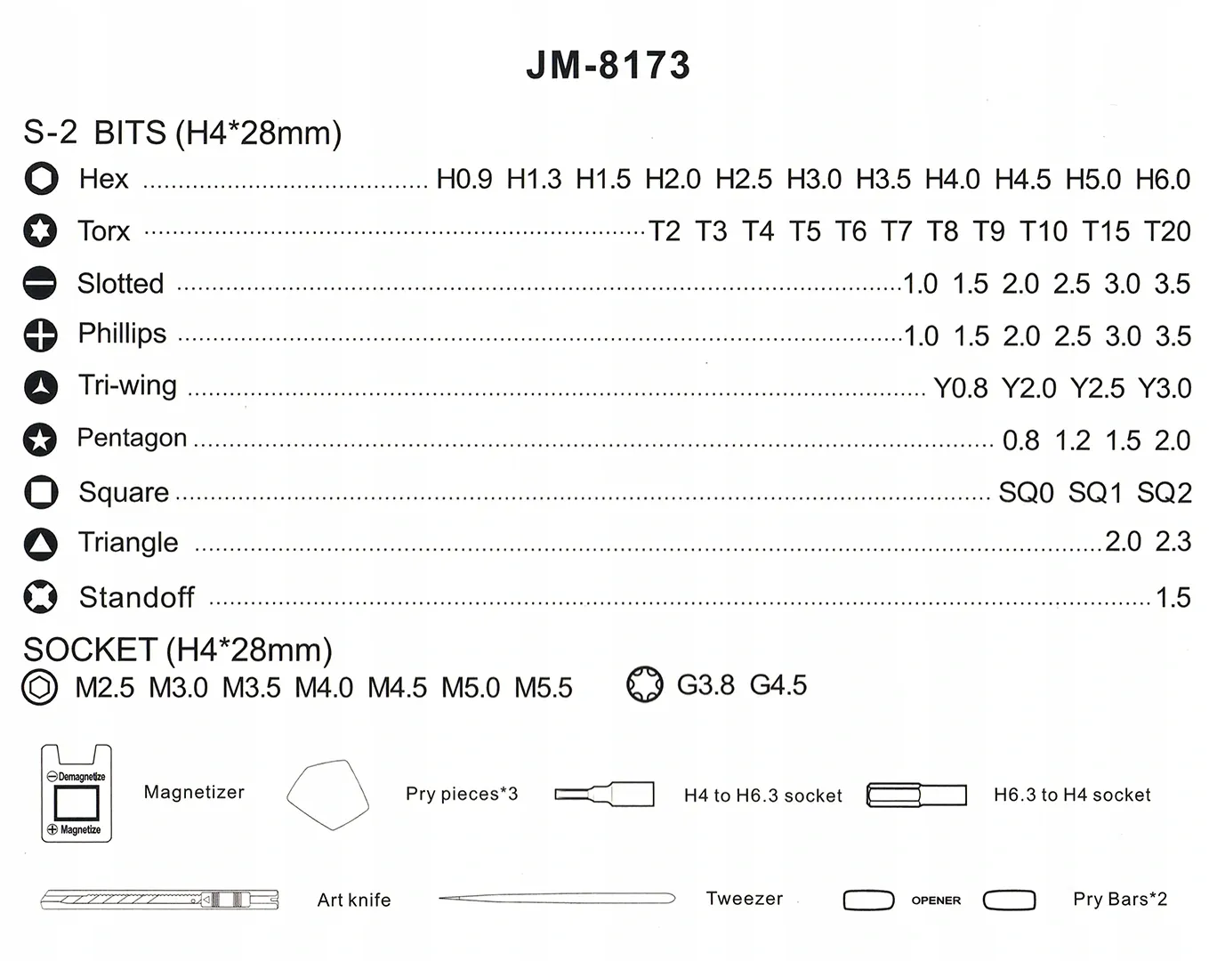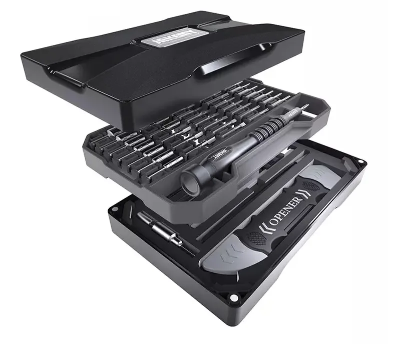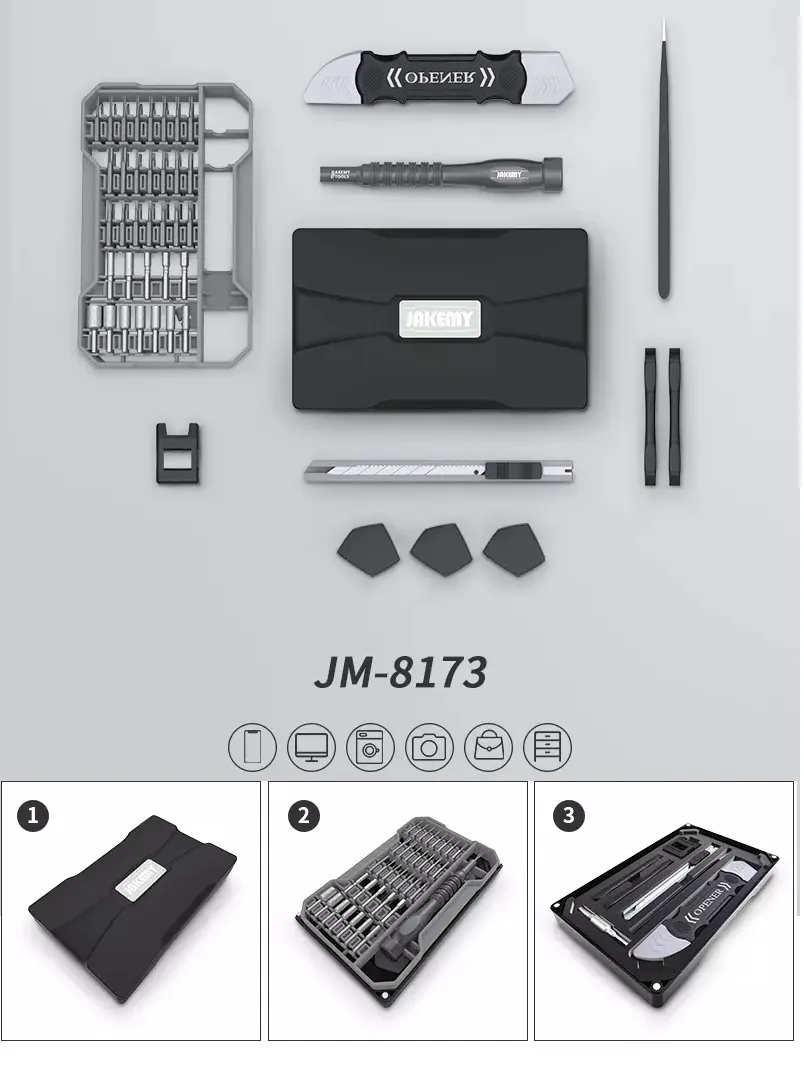 Zestaw Jakemy JM-8173 posiada magnetycznie zamykane opakowanie dzięki czemu dostęp do odpowiedniego narzędzia jest bardzo szybki. Bity są również mocowane magnetycznie dzięki czemu łatwiej jest zachować porządek wewnątrz opakowania.
